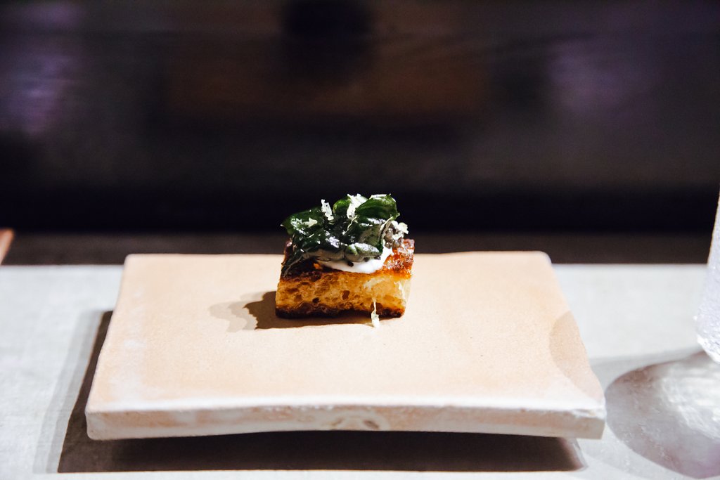Almost burnt toast, maple, chicken emulsion, chives, caviar, black kale, lemon zest