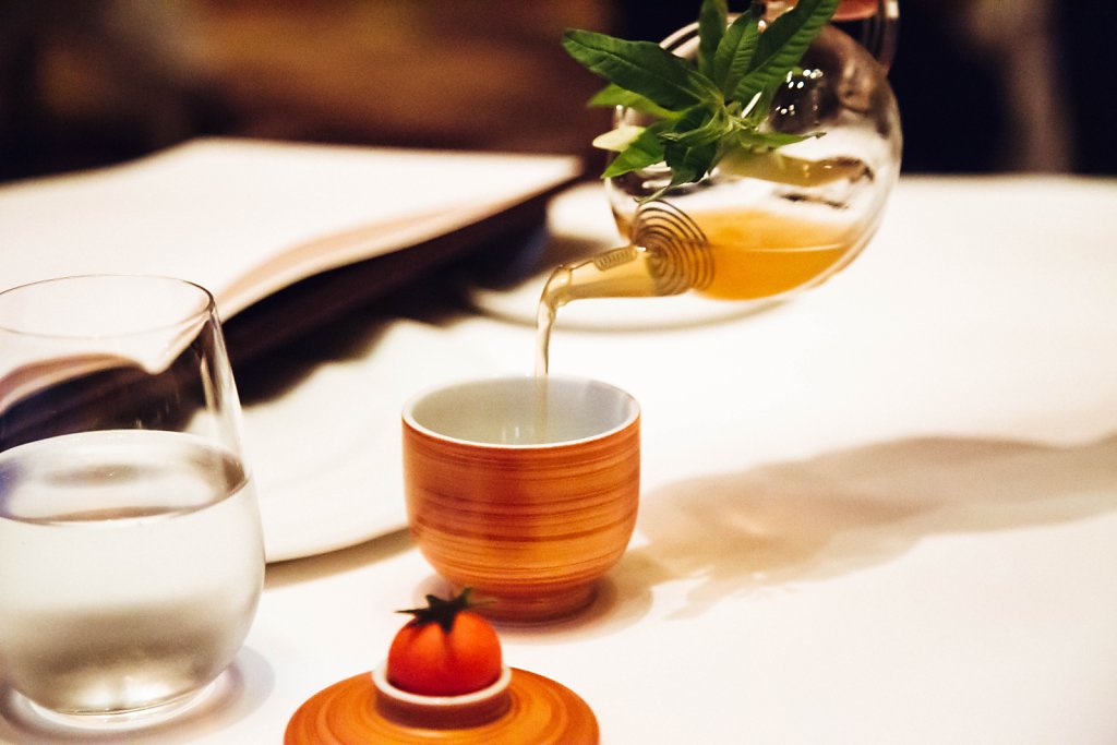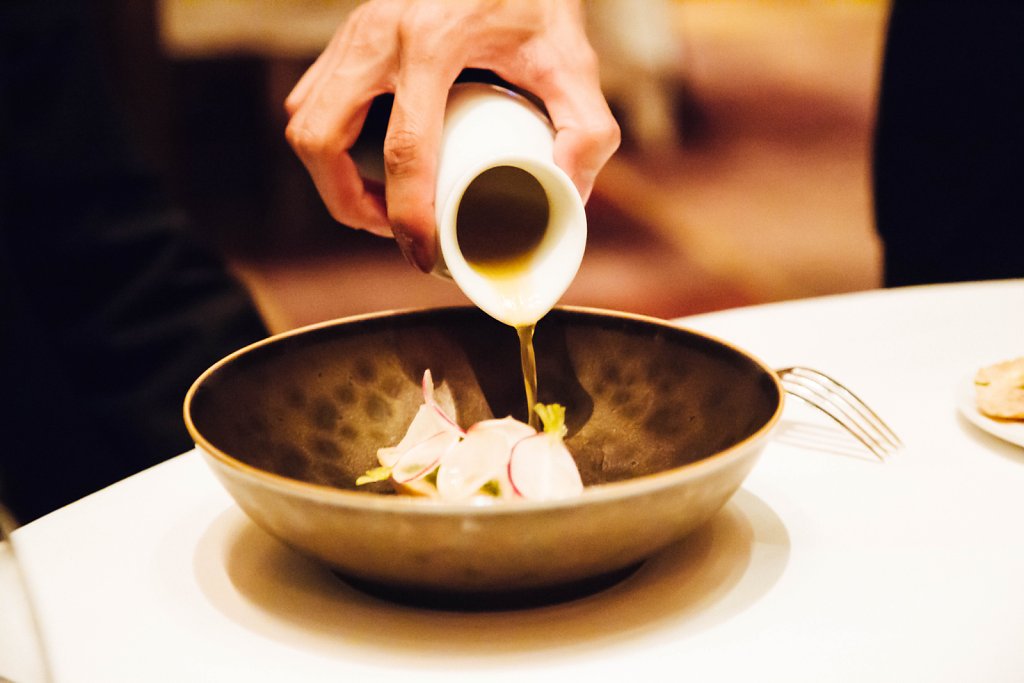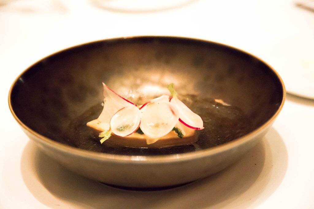 Duck foie grassteamed with fondant daikon, radish & seaweed broth