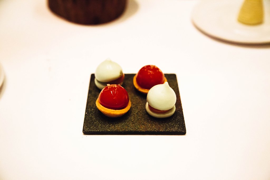 The meal starts off with an amuse bouche of fennel purée disguised as a blanched tomato, placed on top of a pot. The lid of the pot is removed and filled with a tomato broth and we're told to first drink the broth and then eat the "tomato". We're also served a small bite of basil and fennel purée, fennel macaron with tomato puree and a Bloody Mary tart in the shape of a small tomato. Interesting that all the amuse bouches plays with the taste of tomato and fennel. The last dish in the first serving is a small plate of avocado foam, with mushroom, asparagus and a mustard chip which makes the transition from amuse bouches to the first dish of the degustation menu.