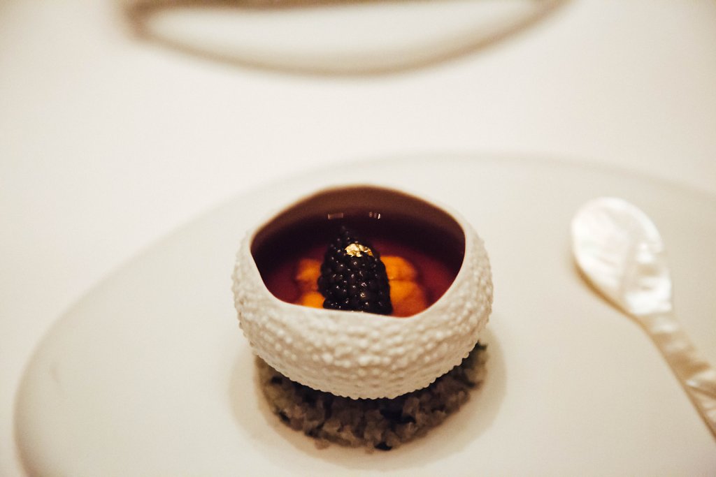 Hokkaido sea urchinin a lobster jell-O with cauliflower, caviar and crispy seaweed waffles