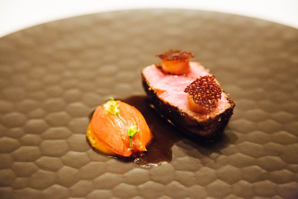 Miyazaki wagyu beefwith strip loin; char-grilled with seaweed & tomato dust, raw & cooked tomatoes & black garlic caramel