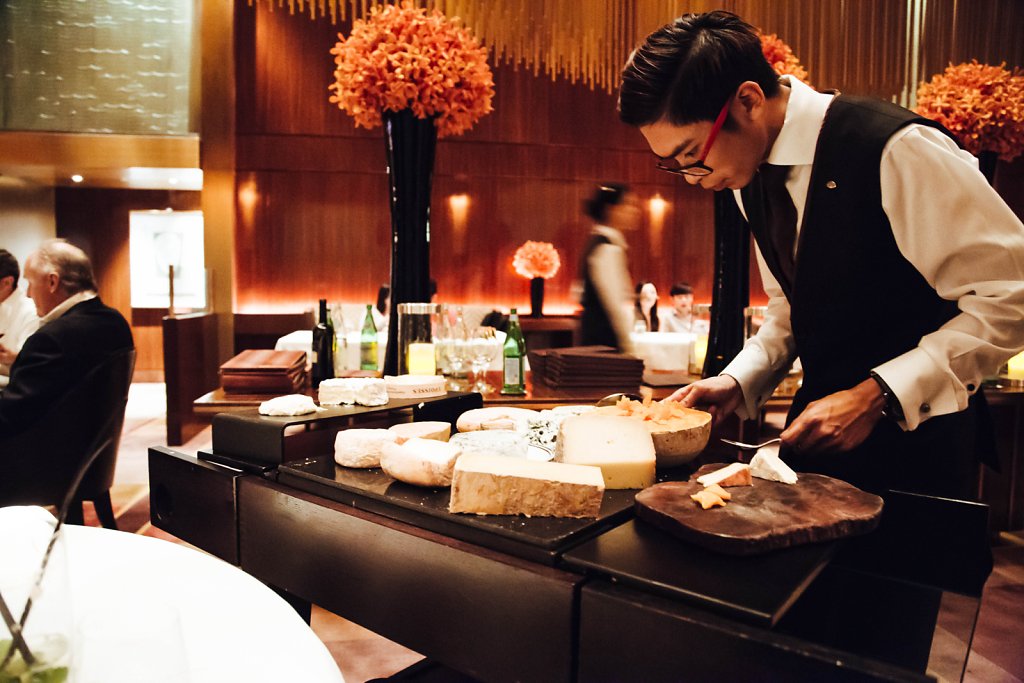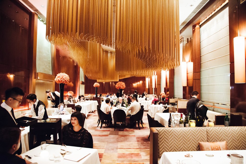 The restaurant is located in the prestigious Landmark Mandarin Oriental Hotel on the 7th floor. The dining room, designed by architect Adam Tihany (named the greatest American interior architects by The New York Times in 2001) is spacious, with 4320 copper rods hanging from the ceiling forming a gigantic chandelier that stretches the entire room. The floor-carpet is thick, and we sit comfortably in our large wooden chairs. This is a grand room but the overall feel is very dated.