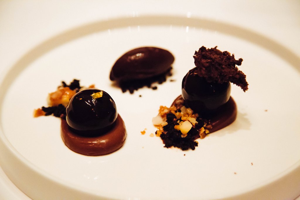 Dulcey chocolatespheres coated in manjari 64% chocolate with salted & caramelized macadamia nuts & cocoa sorbet